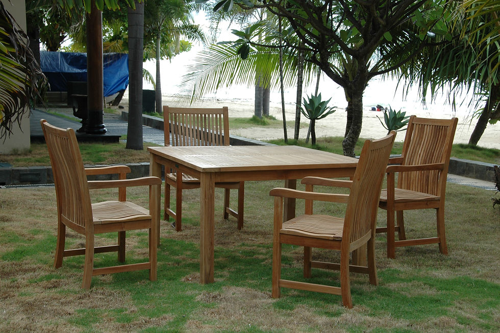The choice of simplicity but yet elegant. Enjoy the rest of the evening with friends and family while sitting on the Chicago Armchair with Windsor 47" square table. This set fits for 4 people comfortably. Chicago chair is designed with a leaning high back and curve for comfort back support and seat. Table and chairs are all constructed using mortise and tenon construction for strength and durability. The outdoor furniture made of premium quality plantation teak from Indonesia where the best teak tree grows. Add all-weather cushions from Sunbrella for extra comfort. This collection is built for generations